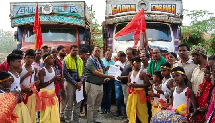 ଭଞ୍ଜନଗର,୨୩/୩ : ରଥ ନିର୍ମାଣ ସକାଶେ ଜଗନ୍ନାଥ, ବଳଭଦ୍ର ଓ ସୁଭଦ୍ରାଙ୍କ ନିମନ୍ତେ ଆଜି ଉତ୍ତର ଘୁମୁସର ବନଖଣ୍ଡର ତାରସିଂ ବନାଞ୍ଚଳର ଆମ୍ବଝରା ଜଙ୍ଗଲରୁ କାଠ ସଂଗ୍ରହ କରି ୨ଟି ଟ୍ରକରେ କାଠ ପୁରୀ ପଠାଯାଇଛି।